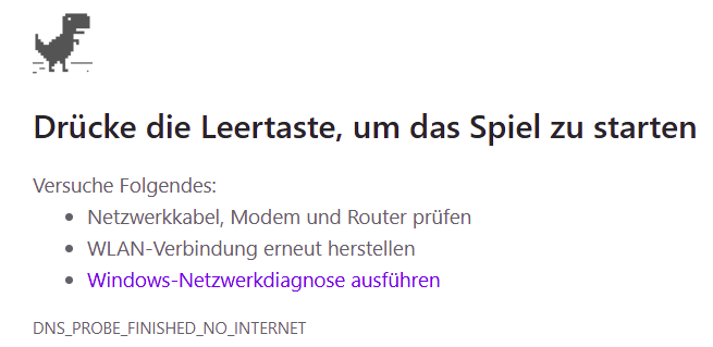 - Wenn diese Seite sich ebenfalls nicht lädt und wieder der Dino erscheint, deutet das stark auf ein lokales Verbindungsproblem hin.