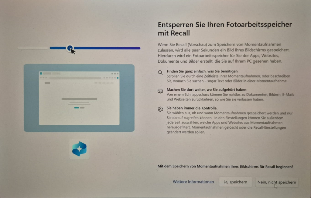 Bevor Sie die Meldung abschalten, lohnt ein kurzer Blick auf die Frage, ob Sie Recall überhaupt nutzen möchten. Recall speichert lokal auf Ihrem Gerät, was Sie auf dem Bildschirm tun, und erlaubt später eine zeitbasierte Suche nach diesen Aktivitäten. Das kann produktiv sein, birgt aber Risiken, wenn andere Zugriff auf Ihren PC haben.