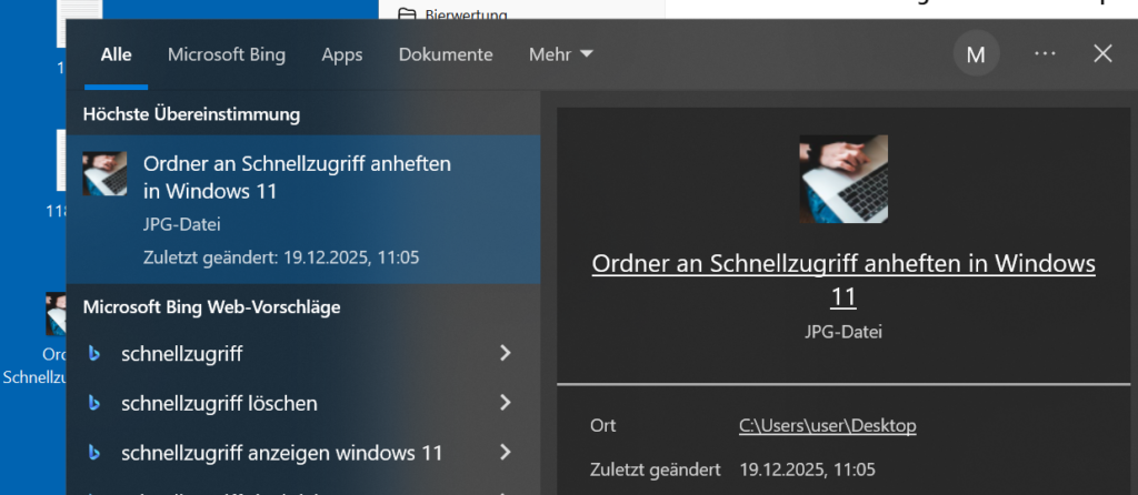 Der Schnellzugriff ersetzt nicht die Suche, ergänzt sie aber ideal. Wer häufig in denselben Ordnern sucht, kann diese anheften und die Suche gezielt dort starten. Das spart Zeit und liefert relevantere Ergebnisse.
