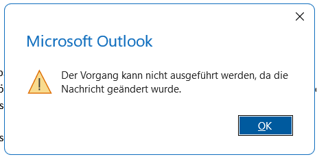 Die Meldung weist darauf hin, dass Outlook und der zugrunde liegende Nachrichtenspeicher (Exchange, Microsoft 365, IMAP oder PST/OST-Datei) sich über den aktuellen Zustand der E-Mail nicht einig sind. Outlook geht davon aus, dass sich die Nachricht zwischen zwei Aktionen verändert hat und blockiert deshalb den Vorgang.